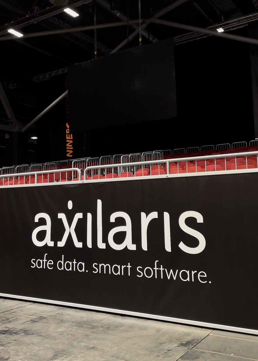 Bedruckte PVC-Plane mit Sicherungsmöglichkeiten für Innen- und Außenanbringung.