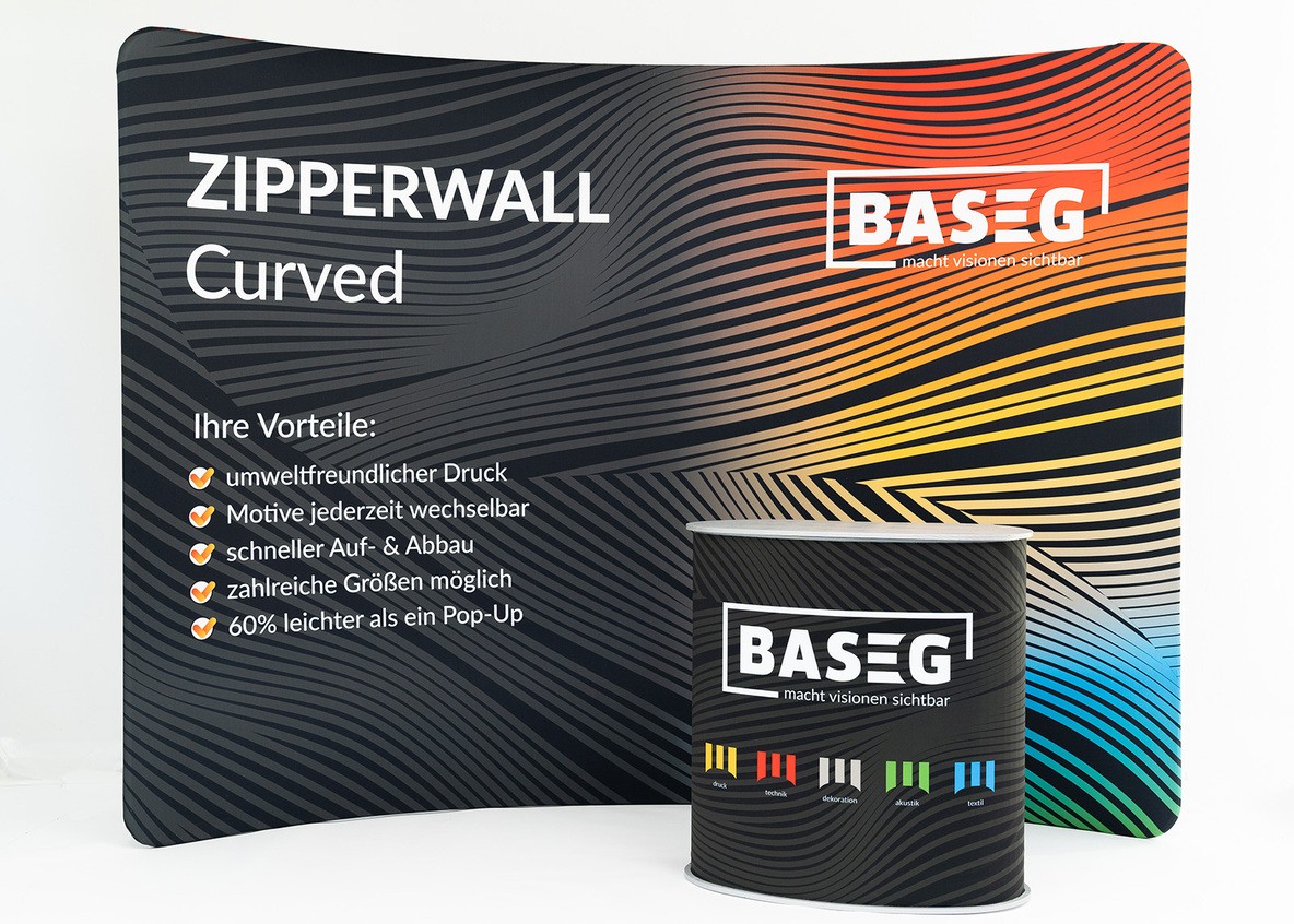 Die Zipper Wall ist die mobile Stoffwand der neuen Generation – noch nie war Präsentieren so einfach, leicht und elegant. Das überraschend schlanke Design der Displaywand sorgt für einen starken Auftritt, auch bei geringem Platz. Das textile Material gibt der Zipper Wall einen hochwertigen Eindruck. Jede Zipper Wall wird zudem mit einem hochwertigen Transporttrolley versandt. So ist das Stoffdisplay leicht zu transportieren, auch im Nah-, Zug- und Flugverkehr. Das geringe Gewicht von nur wenigen Kilogramm erleichtert die Wege zusätzlich.