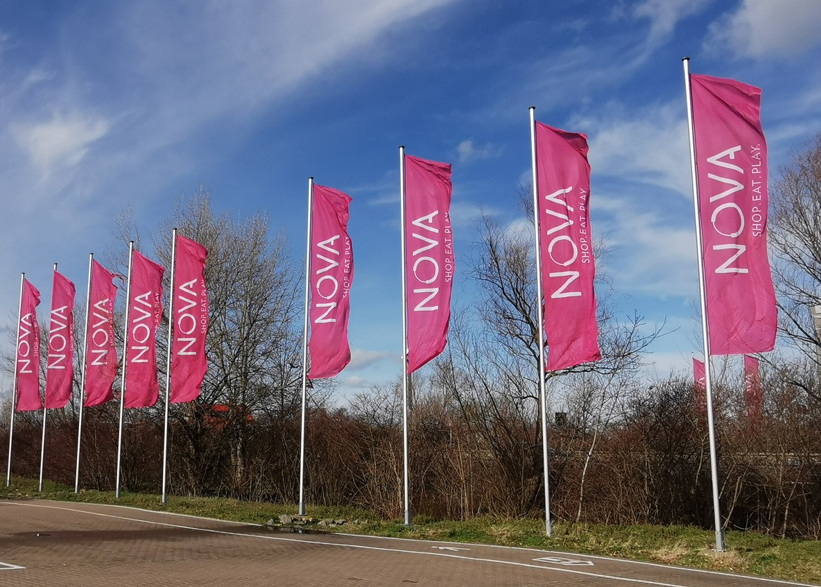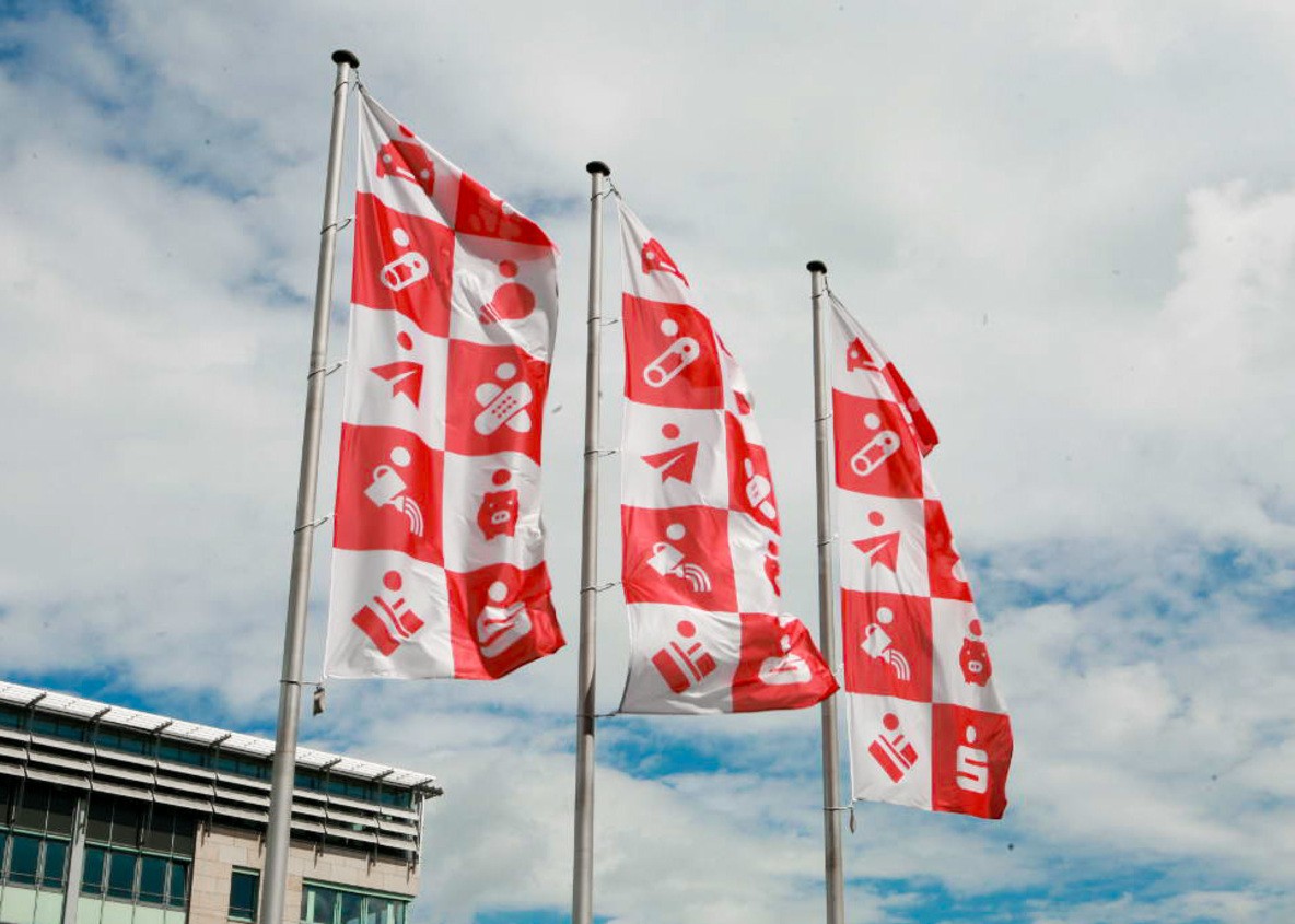 Bedruckte Werbefahnen zum Hissen für Außenwerbung.